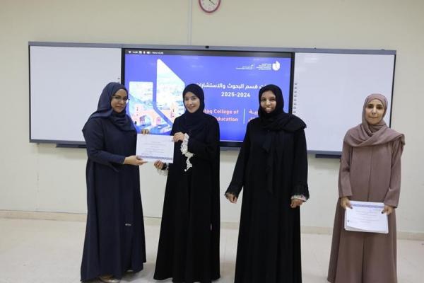 وبدأ الحفل بكلمة قسم البحوث والاستشارات قدمتها الدكتورة زليخة بنت طالب السعدية رئيسة القسم، بعدها قدم عرضا مرئيا لإنجازات الباحثين والكلية في مجال البحث العلمي خلال عامي ٢٠٢٤ و٢٠٢٥ وفي الختام كرمت الدكتورة سارة بنت محمد البهلانية عميد الكلية الباحثين والمساهمين في البحوث.