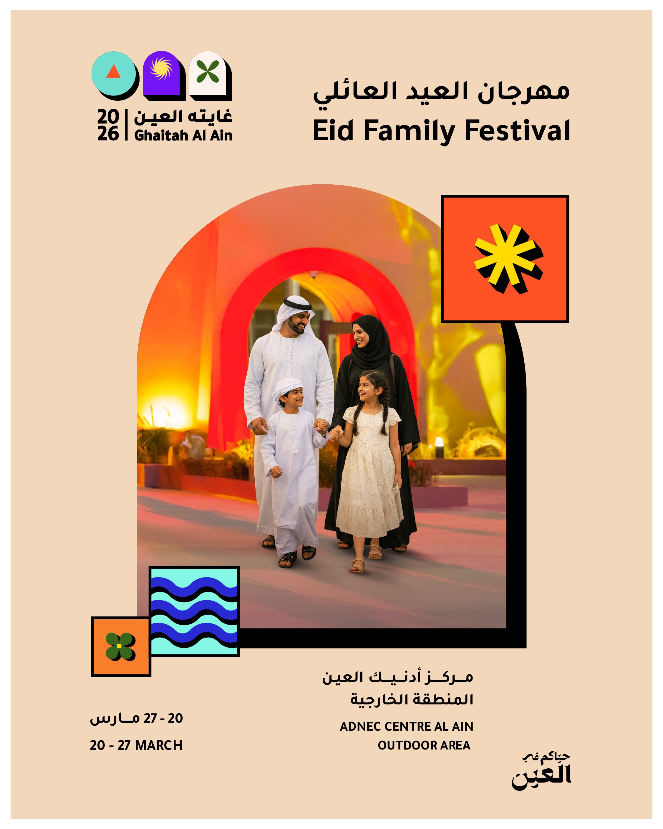 ويحتفي المهرجان بروح عيد الفطر السعيد وأجواء منطقة العين النابضة بالحياة من خلال برنامجه الحافل بالعروض الحية، والأنشطة الترفيهية المُناسبة لجميع الأعمار، والفعاليات الثقافية ومناطق الألعاب، إلى جانب مسرح رئيسي يستضيف عروض الفنون الأدائية والتراثية المباشرة. وتُتاح للزوار أيضاً فرصة استكشاف مساحات مُخصصة للفنون، والمشاركة في ورش عمل تفاعلية.